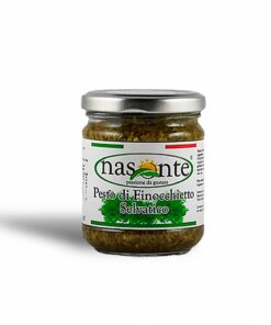 - Wild fennel pesto by Nasonte, a unique version of pesto with a strong and intense flavour and notes of anise. Made mainly of 75% wild fennel tips, sun-dried natural tomato (free of sulphites), almonds, EVO oil, ground black pepper, white Divine vinegar and salt, ideal for seasoning first courses, main courses and side dishes and for making delicious snacks.