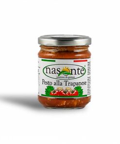 - Pesto alla Trapanese, by Nasonte, is a ready-made sauce of Trapani tradition, prepared with fresh tomatoes, toasted almonds and Evo oil. Slightly spicy, it is capable of making any pasta dish special. Better in combination with busiate but also delicious to try on bruschetta.