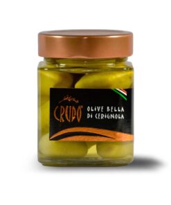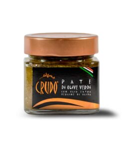 - 2 x 180 g green olives patè jars, soft and velvety creams processed with “Crudo” extra virgin olive oil.