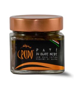 - 2 x 180 g black olives patè jars, soft and velvety creams processed with “Crudo” extra virgin olive oil.